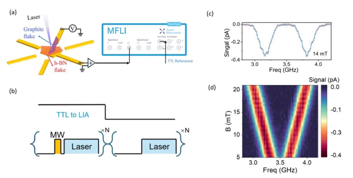 該團隊成功實現了對范德華材料(van der Waals, vdW materials)中自旋缺陷(spin defects)的室溫電學讀出(electrical readout)。在這項極具挑戰性的實驗中,Zurich Instruments 的 MFLI 鎖相放大器(lock-in amplifier)憑藉其卓越的低雜訊電訊號測量能力,成為探測微弱電學探測磁共振(Photocurrent Detected Magnetic Resonance, PDMR)訊號的核心利器。