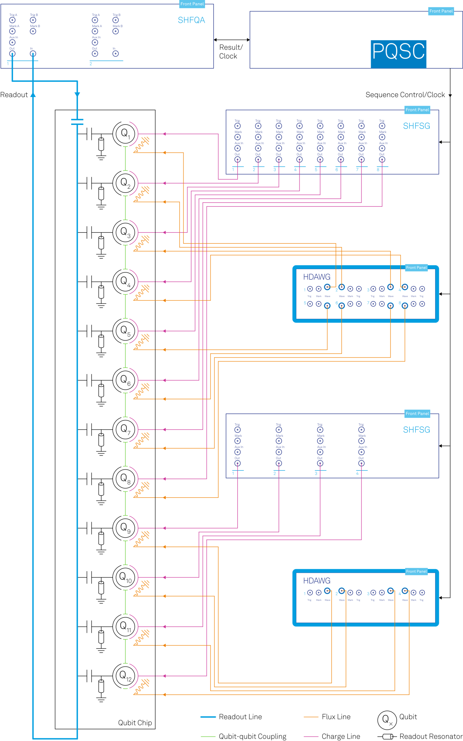 - 優勢:SHFQA 的即時量子態鑒別以及所有控制和讀出儀器(SHFQA、SHFSG 和 HDAWG)的即時決策和分支,可通過 PQSC 同步運行最先進的回饋代碼, 也就是從用於量子比特初始化的快速主動重置到表面代碼的全域伴隨式解碼。