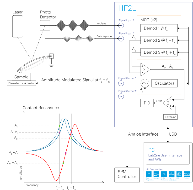 接著,可以在訊號輸出端產生振幅調變訊號(AM),在接觸共振點兩側形成兩個邊帶振幅 A1 和 A2。在圖中,紅色曲線顯示了 A2 - A1 隨驅動頻率變化的關係:該差值在共振附近呈現單調變化,且具有良好的增益靈敏度,因此可作為回授信號(feedback)。