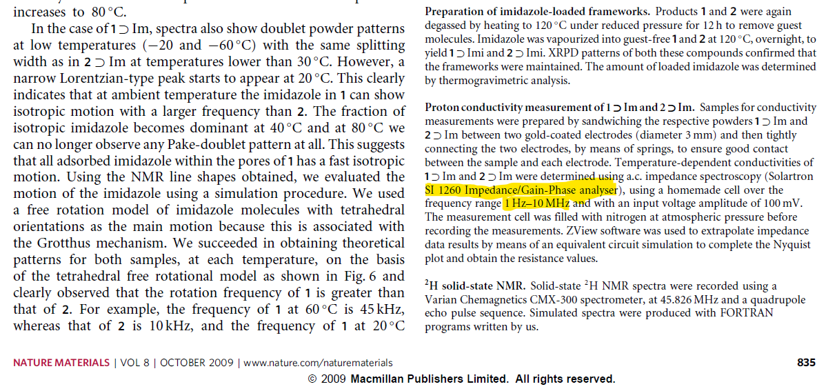 在北川進(Susumu Kitagawa)教授研究中,使用Solartron 1260A做為高頻量測的選擇。