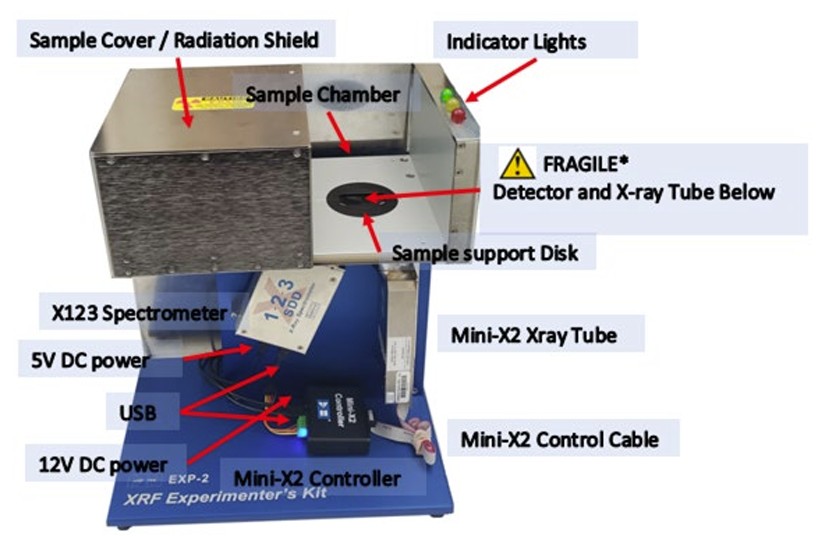 EXP-2 Complete XRF Experimenter’s Kit 實驗套件包含三款獨立的標準Amptek產品和一個獨特的機械裝置。標準組件包括: